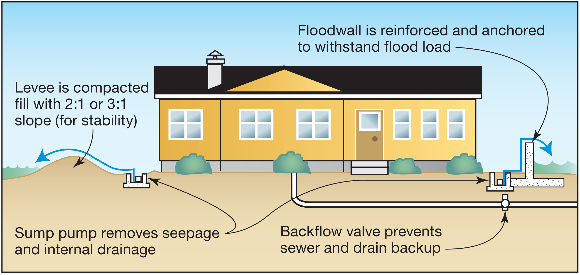 Vulnerable building sites can be protected from floods through the use of levees and floodwalls. Levees and berms are structures made of compacted earthen materials with interior cores of impermeable soil (i.e. clay). Construction typically begins with excavation to ensure subsurface soil conditions are taken into account in design. Floodwalls are typically engineered structures made of reinforced concrete. Floodwalls can be built up to 20 feet in height and can be designed to be aesthetically pleasing architectural and landscape features. Floodwalls are typically more expensive to construct than levees, but require less space and landscaping and are more resistant to erosion. Construction of all floodwalls and levees should be undertaken by licensed engineers.